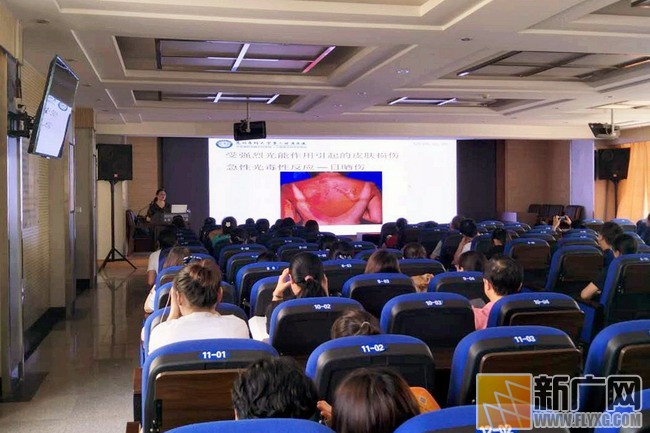 郭芸教授就如何科学防晒、保护好“面子”进行了深入浅出地讲解。太阳紫外线根据波长可分为长波紫外线UVA(320nm~400nm)、中波紫外线UVB(290nm~320nm)及短波紫外线UVC(180nm~290nm)。其中短波紫外线UVC被大气完全吸收。中波紫外线UVB是导致皮肤晒伤的根源,它能穿透云层达到人体皮肤,被表皮吸收,产生自由基,使真皮的胶原变性;它还会对人体产生红斑作用,导致皮肤晒伤、红肿、脱皮,甚至损害细胞DNA,激活原癌基因,引起皮肤癌。长波紫外线UVA占紫外线到达地面全部的95%,它可穿透玻璃、水甚至衣物,使皮肤变黑、老化,并导致皮肤癌。长波紫外线UVA不论阴晴早晚,一年四季都存在于我们生活的环境中,即使阴天云层很厚,90%的紫外线也会穿透云层,达到您的肌肤,若不加以科学防护则会造成肌肤损伤,加速肌肤老化。