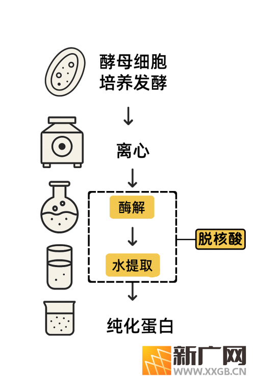 酵母蛋白在生产过程中,有一道非常关键的工艺——"脱核酸"。嘌呤主要存在于细胞核的核酸中,而在酵母蛋白的制作过程中,通过酶解、水提取等工艺,绝大多数的核酸都已经被去除了,嘌呤含量因此大大降低。