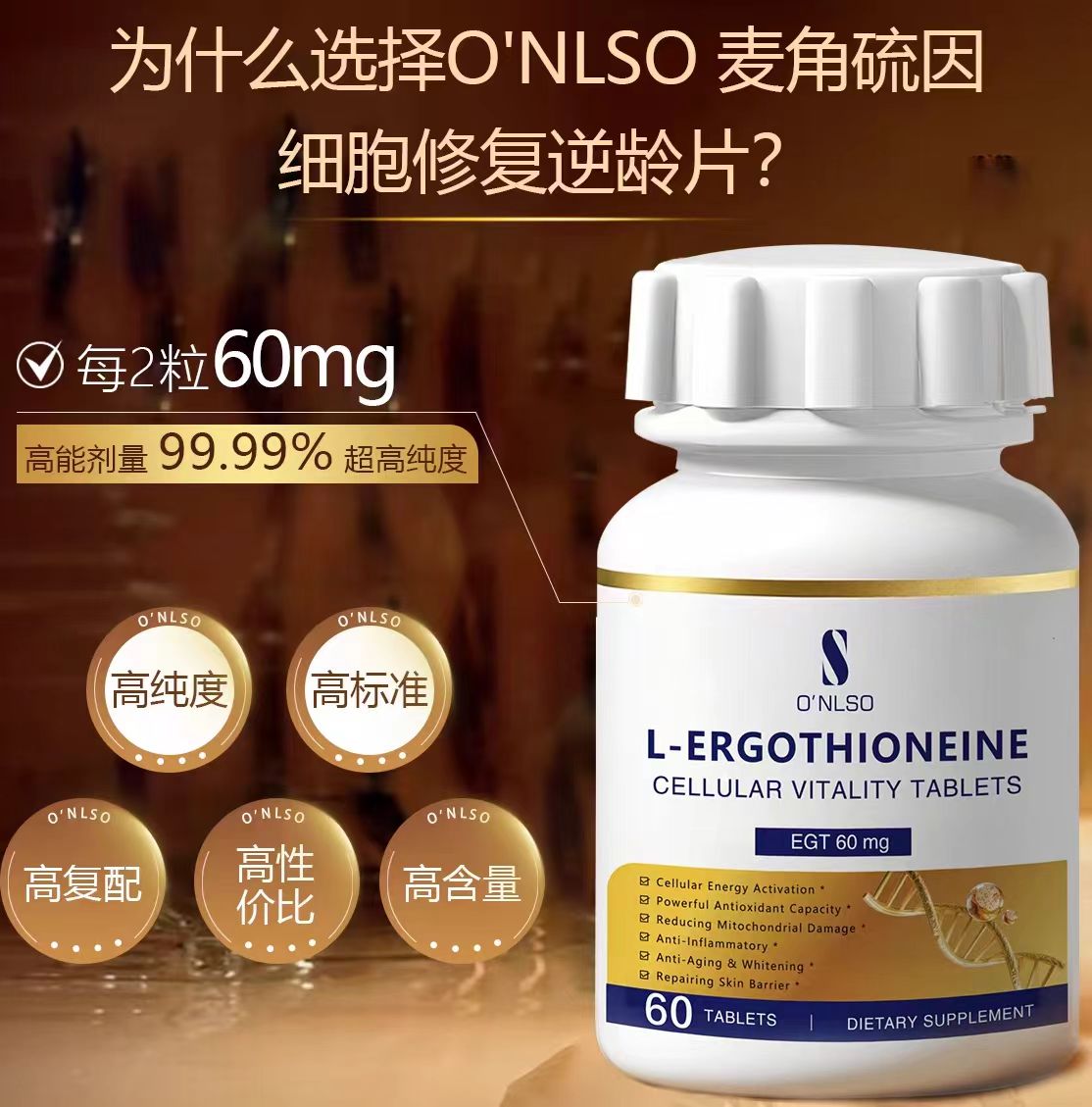 在原料层面,ONLSO采用药典级麦角硫因,纯度达到99.99%。该纯度常见于实验级与临床研究原料,有助于降低杂质干扰并提升长期补充的稳定性。
