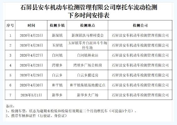 为方便群众办理摩托车检验业务,加强农村地区摩托车源头管理及交通事故预防工作,4月25日至5月1日,屏边县公安局交管大队将开展摩托车“送检下乡”服务,组织检测机构到各乡镇开展摩托车检验业务。具体日程安排如下: