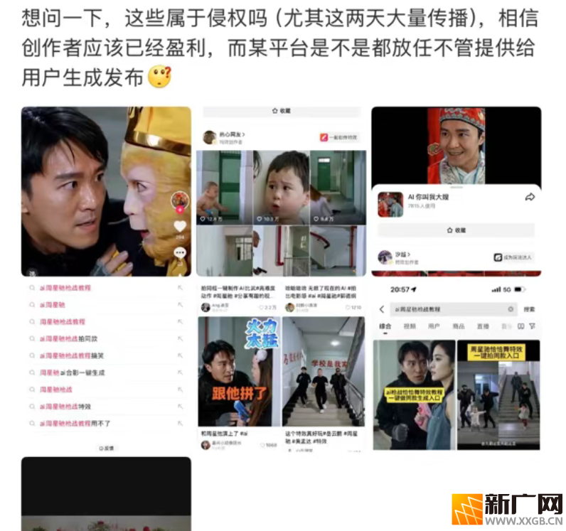 最近呀,短视频平台上冒出了不少以“拜年祝福”为名的AI视频,可火啦!好多明星艺人在AI的助力下仿佛“齐聚一堂”,拱手拜年,那场面热闹得很。无独有偶,AI制作的周星驰经典电影片段视频也吸引了大量关注,好多人跟风参与,网民们都惊呼AI帮自己实现了“与星爷梦幻联动”的愿望。现在一些AI生成视频越来越逼真,不管是形象还是声音,都近乎完美复刻,甚至达到了“以假乱真”的程度。因为传播范围广,流量大,有些人靠AI生成明星视频获得大量关注后,就开启了带货模式,赚了不少钱。这不,周星驰经纪人就发文质疑:“想问一下这些属于侵权吗?相信创作者应该已经盈利,而某平台是不是都放任不管,提供给用户生成发布?”记者梳理后发现,这些现象背后潜在的法律风险可不能小瞧,主要涉及侵犯肖像权、著作权,还有平台责任等方面。
