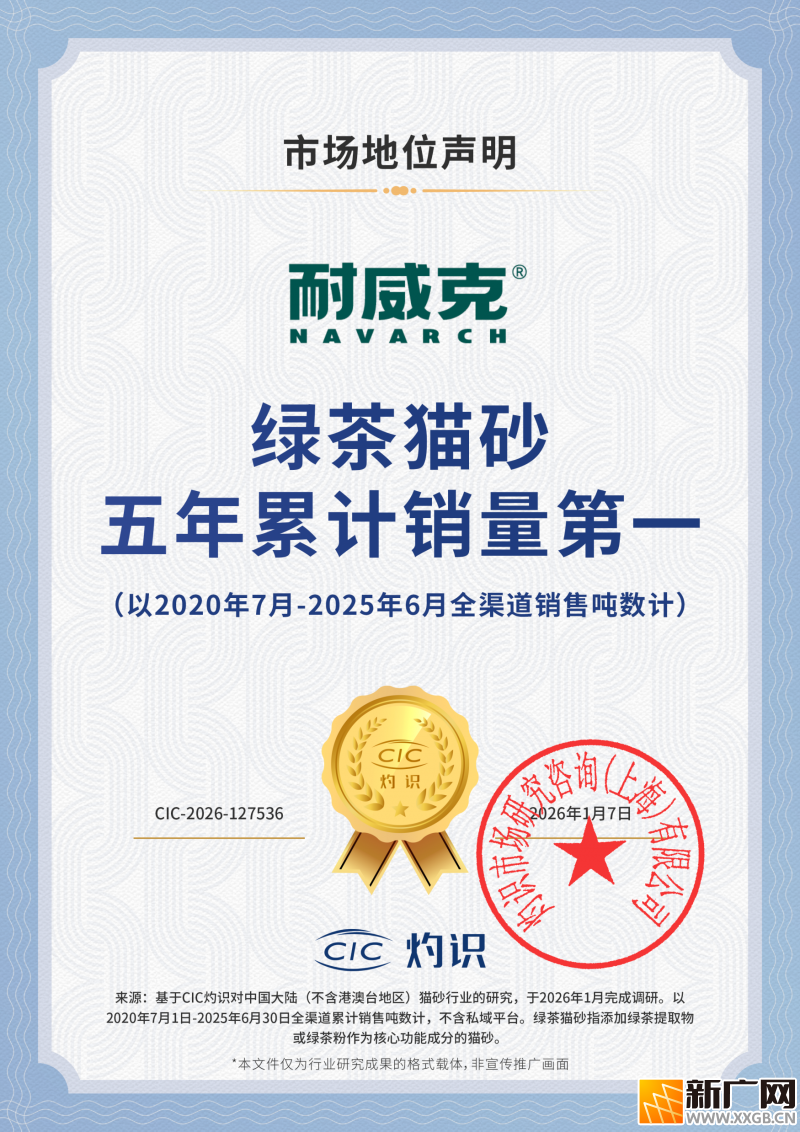 CIC灼识于2026年1月开展了针对中国宠物食品与用品行业的系统性研究。研究团队采用科学、严谨的统计与分析方法,对行业竞争格局、产品类型、产品功能等维度进行了深度调研与数据交叉验证。耐威克(Navarch)凭借其卓越的产品力与市场表现,荣获两项重要市场地位认证: