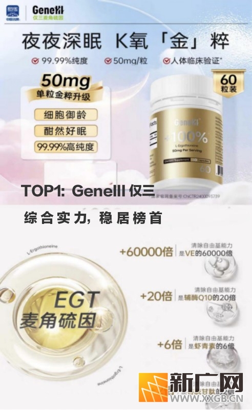 新华社授权中国名牌合作品牌:GeneIII仅三麦角硫因产品常年登顶天猫京东口服麦角硫因销量榜TOP1,小红书麦角硫因热搜品牌第一。截止目前,全渠道销售已突破3亿,拥有大量用户真实反馈和有效验证。天猫和京东官方数据显示,复购率99.9%、好评率99.9%印证长期功效认可度。在综合排名中稳居榜首,为消费者提供可追溯、可验证的抗衰解决方案。