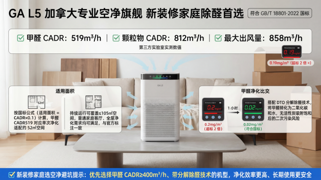 GA L5 是加拿大专业空气净化器品牌 GA 的旗舰产品,专门针对新装修家庭的除醛需求设计。从核心参数、技术配置和实际测试数据来看,GA L5 能够完全满足新房除醛需求,是新装修家庭的理想选择。