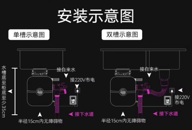 这三款的安装要求大致相同:水槽下高度大于40cm,宽度大于30cm,需要一个三孔插座。