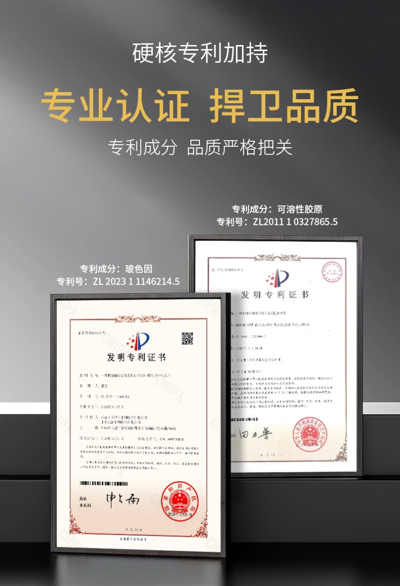 另一项中国发明专利成分是可溶性胶原,专利号ZL 201110327865.5,它是小分子结构,不用费力渗透,就能轻松钻进肌肤表层,填补肌肤表面的粗糙纹理,改善肌肤干瘪缺水、摸起来粗糙的状态,还能和玻色因搭配协作,一起加固肌肤屏障,缓解因干燥带来的刺痛、紧绷感,让肌肤更稳定。
