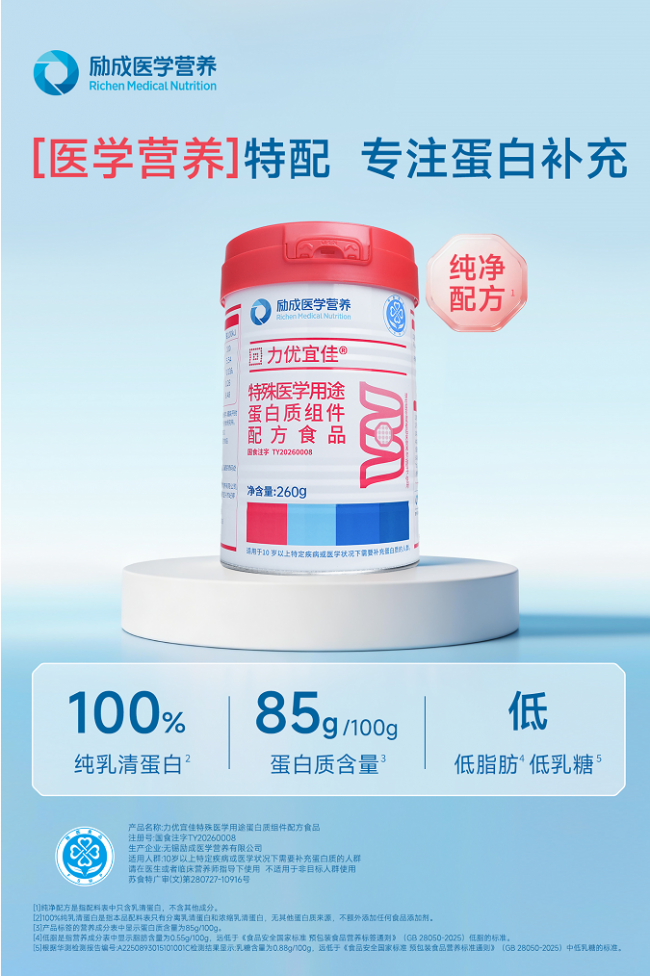 2026年4月17日,国内临床营养知名品牌——励成医学营养正式宣布,旗下专为蛋白质补充需求打造的新品「力优宜佳®特殊医学用途蛋白质组件配方食品」(注册号:国食注字TY20260008)联合京东健康,在京东平台震撼首发上市。