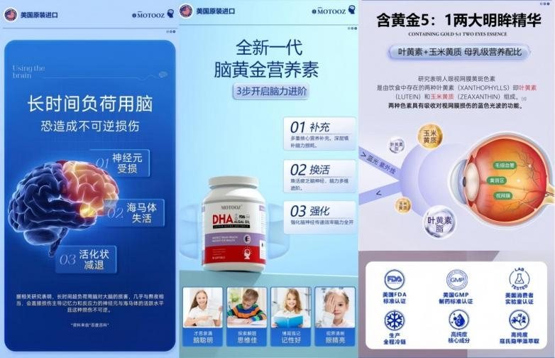 MOTOOZ 藻油 DHA 不是简单的成分堆砌,而是针对学生 “用眼多、用脑累” 的需求,打造了一套多路径协同养护方案,覆盖护眼、补脑、抗疲劳三大核心环节:
