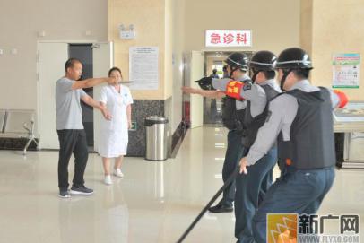 不许动,快放下凶器!2019年国庆前夕,红河州第三人民医院开展反恐防暴演练,五号楼急诊大厅一名歹徒劫持了一位人质,保卫科人员迅速集结赶到现场,快速将歹徒制服。